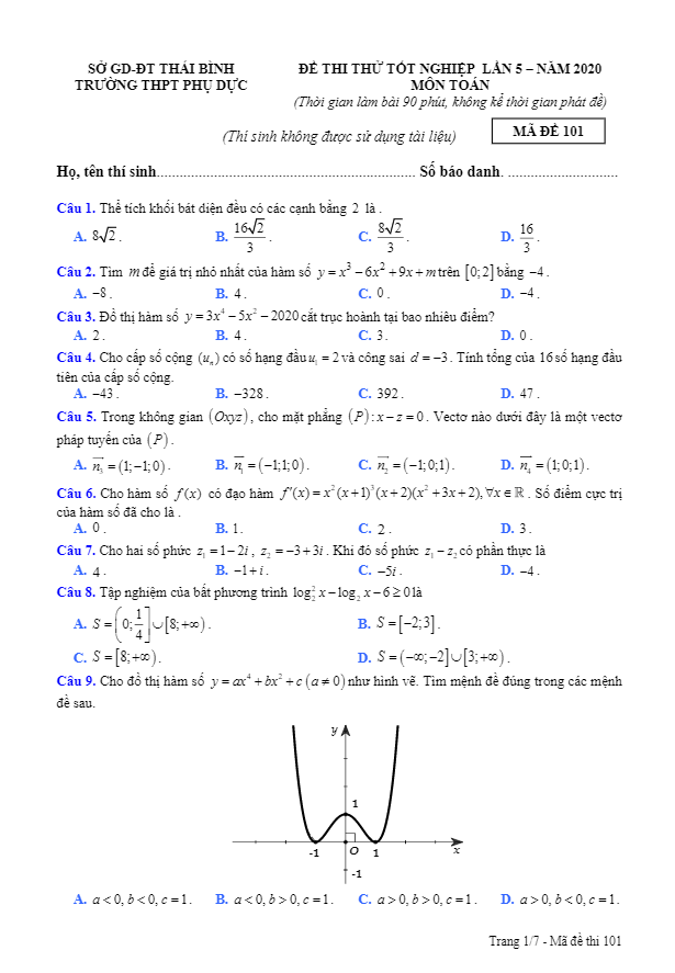 Đề Thi Thử THPT Môn Toán Đề thi thử tốt nghiệp THPT 2020 môn Toán lần 5 trường THPT Phụ Dực – Thái Bình 03/08/2020