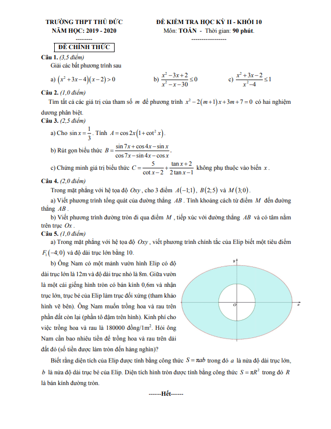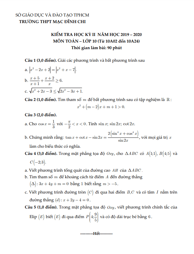 Đề Thi HK2 Toán 10 Đề thi học kì 2 Toán 10 năm 2019 – 2020 trường THPT Mạc Đĩnh Chi – TP HCM 01/08/2020