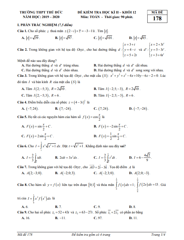 Đề Thi HK2 Toán 12 Đề thi học kì 2 Toán 12 năm 2019 – 2020 trường chuyên Trần Đại Nghĩa – TP HCM 01/08/2020