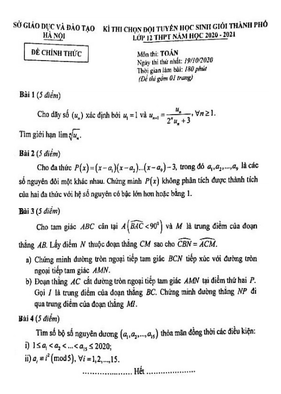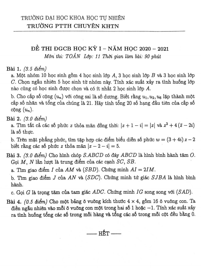 Khảo Sát Chất Lượng Toán 11 Đề ĐGCB học kỳ 1 Toán 11 năm 2020 – 2021 trường THPT chuyên KHTN – Hà Nội 22/10/2020