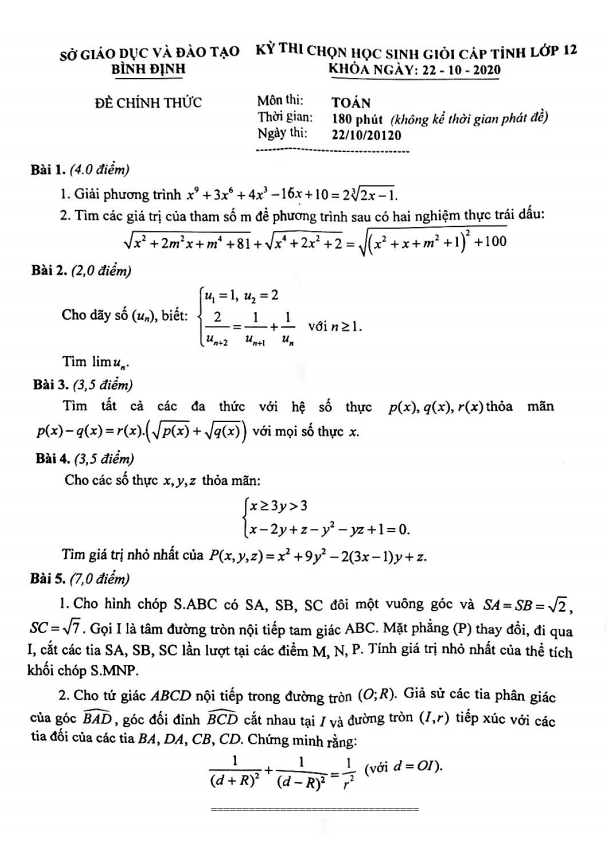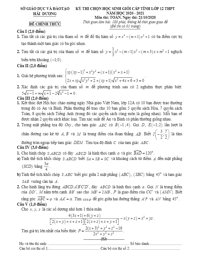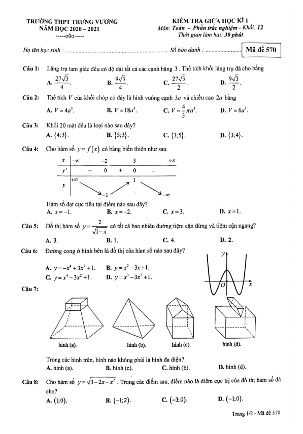 Đề Thi Giữa HK1 Toán 12 Đề kiểm tra giữa HK1 Toán 12 năm 2020 – 2021 trường THPT Trưng Vương – TP HCM 24/10/2020