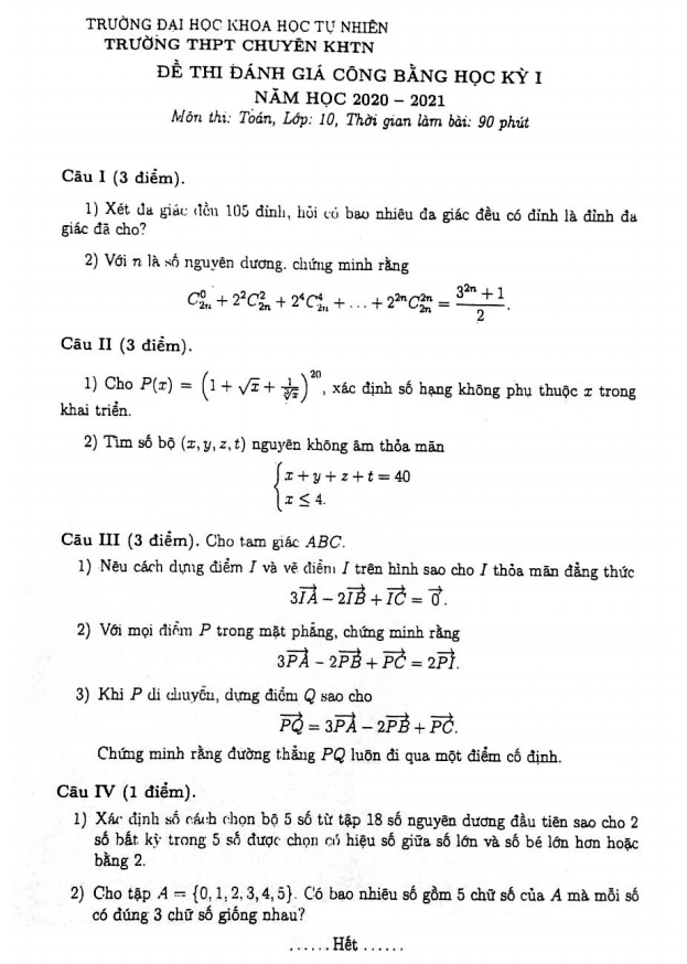 Khảo Sát Chất Lượng Toán 10 Đề ĐGCB học kỳ 1 Toán 10 năm 2020 – 2021 trường THPT chuyên KHTN – Hà Nội 22/10/2020
