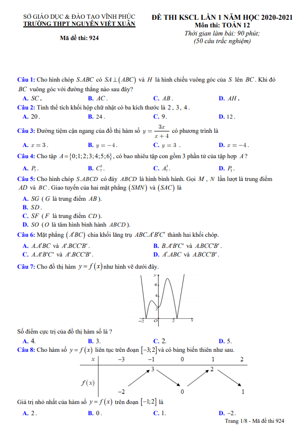 Đề Thi Thử THPT Môn Toán Đề KSCL lần 1 Toán 12 năm 2020 – 2021 trường THPT Nguyễn Viết Xuân – Vĩnh Phúc 25/10/2020