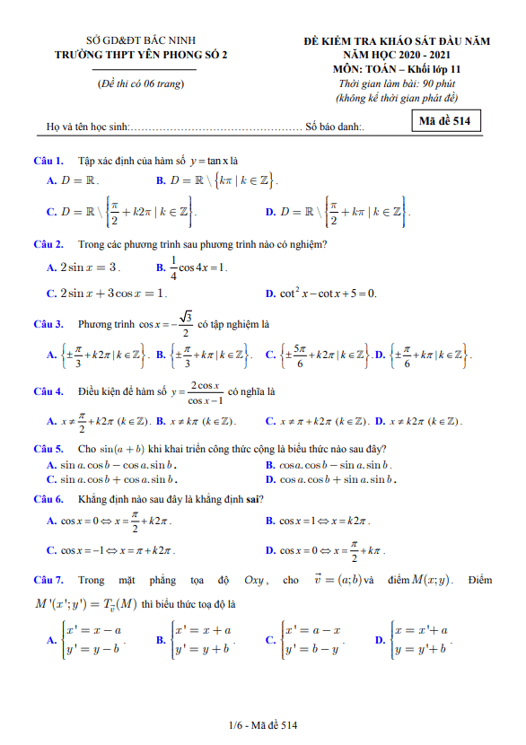 Đề KSCL đầu năm Toán 11 năm 2020 – 2021 trường Yên Phong 2 – Bắc Ninh