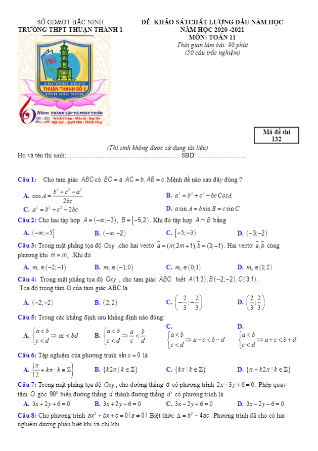 Đề KSCL Toán 11 đầu năm học 2020 – 2021 trường Thuận Thành 1 – Bắc Ninh