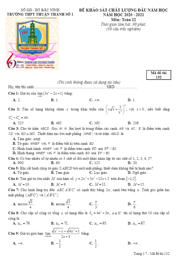 Đề KSCL Toán 12 đầu năm học 2020 – 2021 trường Thuận Thành 1 – Bắc Ninh