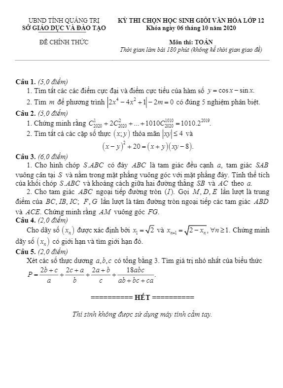 Đề thi học sinh giỏi Toán 12 năm 2020 – 2021 sở GD&ĐT Quảng Trị