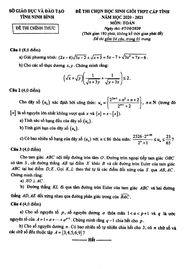 Đề thi HSG Toán THPT cấp tỉnh năm 2020 – 2021 sở GD&ĐT Ninh Bình