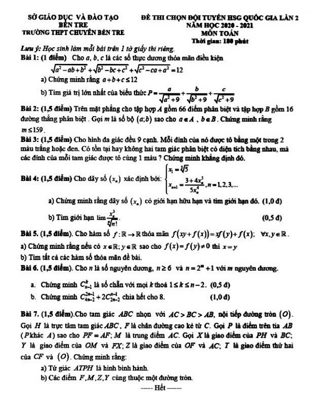 Đề Thi HSG Toán 12 Đề chọn đội tuyển thi HSG Toán Quốc gia 2020 – 2021 trường chuyên Bến Tre (lần 2) 17/11/2020