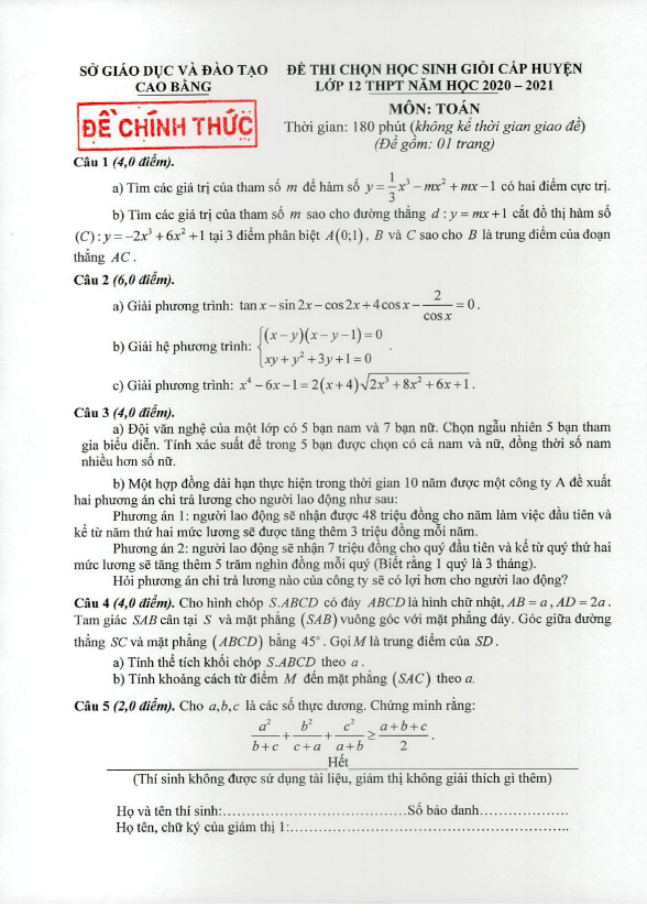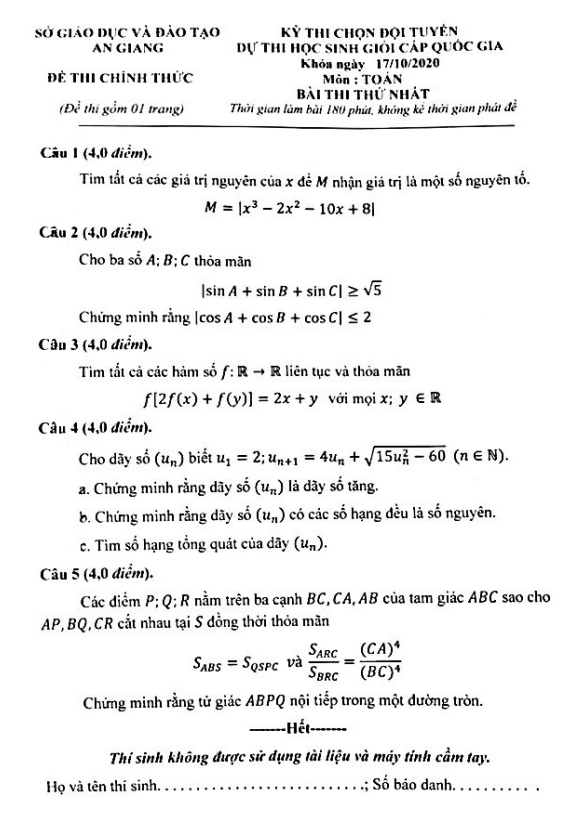 Đề Thi HSG Toán 12 Đề chọn đội tuyển thi HSG Toán Quốc gia năm 2020 – 2021 sở GD&ĐT An Giang 17/11/2020