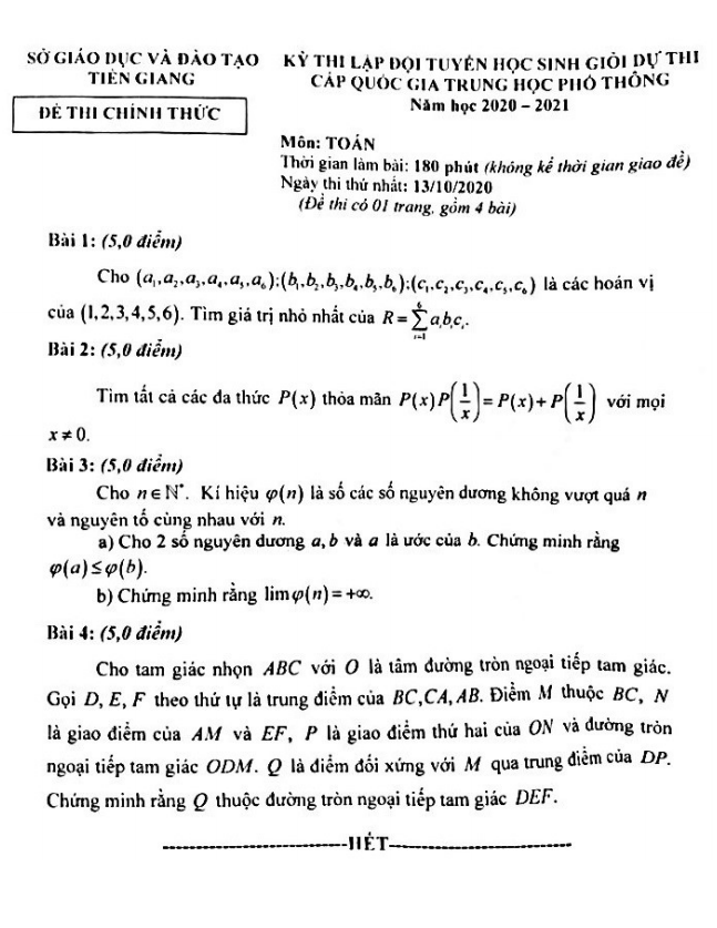 Đề Thi HSG Toán 12 Đề chọn đội tuyển thi HSG Toán Quốc gia năm 2020 – 2021 sở GD&ĐT Tiền Giang 17/11/2020