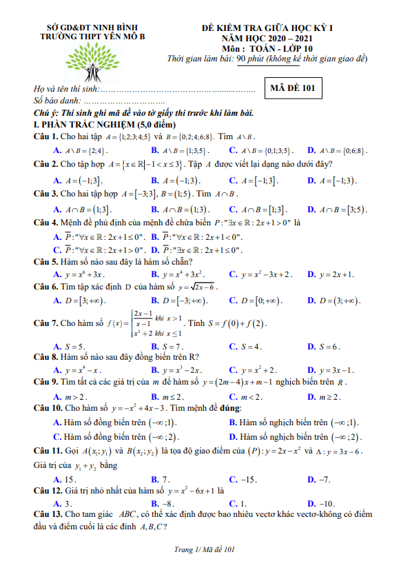 Đề Thi Giữa HK1 Toán 10 Đề kiểm tra giữa HK1 Toán 10 năm 2020 – 2021 trường THPT Yên Mô B – Ninh Bình 14/11/2020