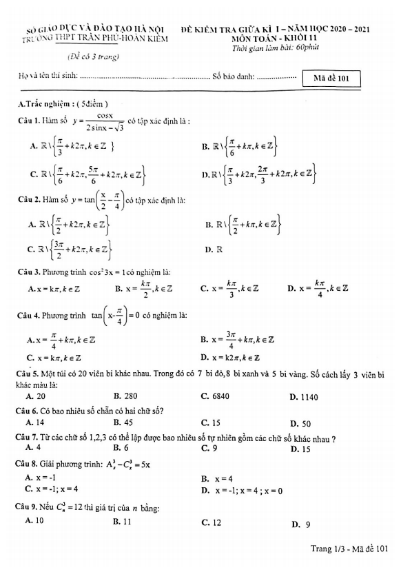 Đề Thi Giữa HK1 Toán 11 Đề kiểm tra giữa kì 1 Toán 11 năm 2020 – 2021 trường THPT Trần Phú – Hà Nội 13/11/2020