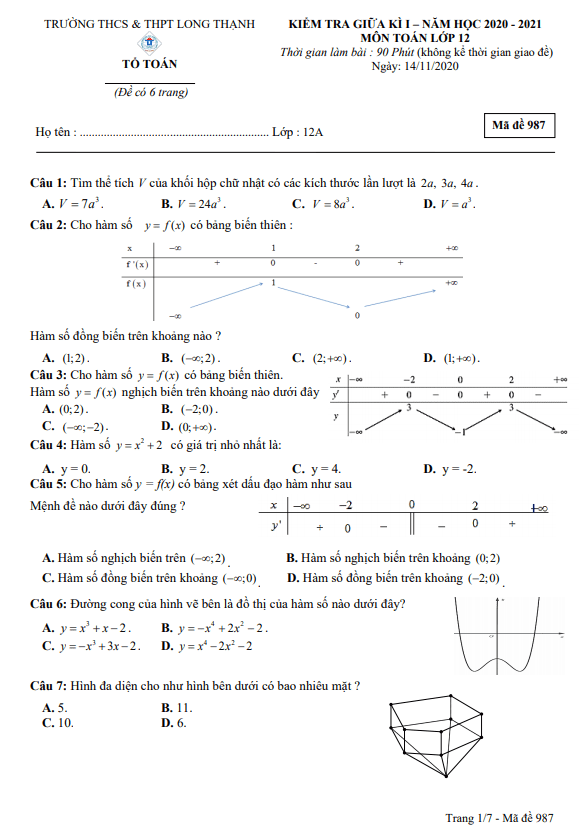 Đề Thi Giữa HK1 Toán 12 Đề kiểm tra giữa kì 1 Toán 12 năm 2020 – 2021 trường THCS&THPT Long Thạnh – Kiên Giang 14/11/2020