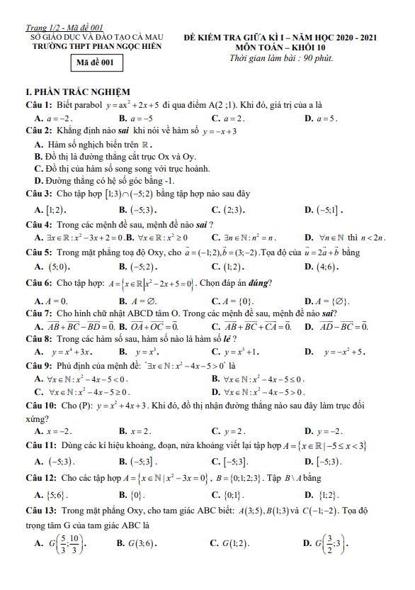 Đề Thi Giữa HK1 Toán 10 Đề thi giữa HK1 Toán 10 năm 2020 – 2021 trường THPT Phan Ngọc Hiển – Cà Mau 16/11/2020