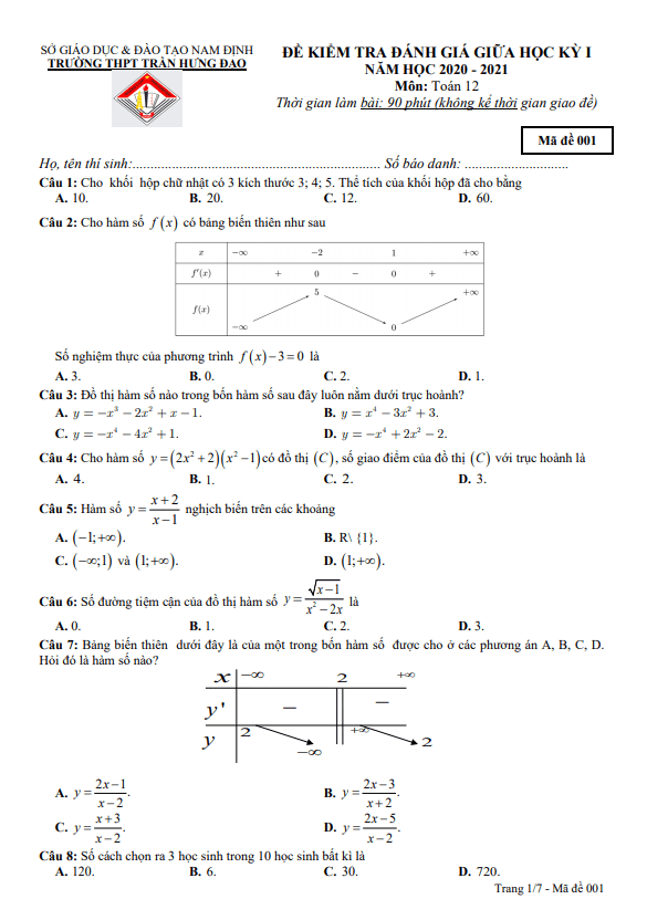 Đề Thi Giữa HK1 Toán 12 Đề thi giữa HK1 Toán 12 năm 2020 – 2021 trường THPT Trần Hưng Đạo – Nam Định 13/11/2020