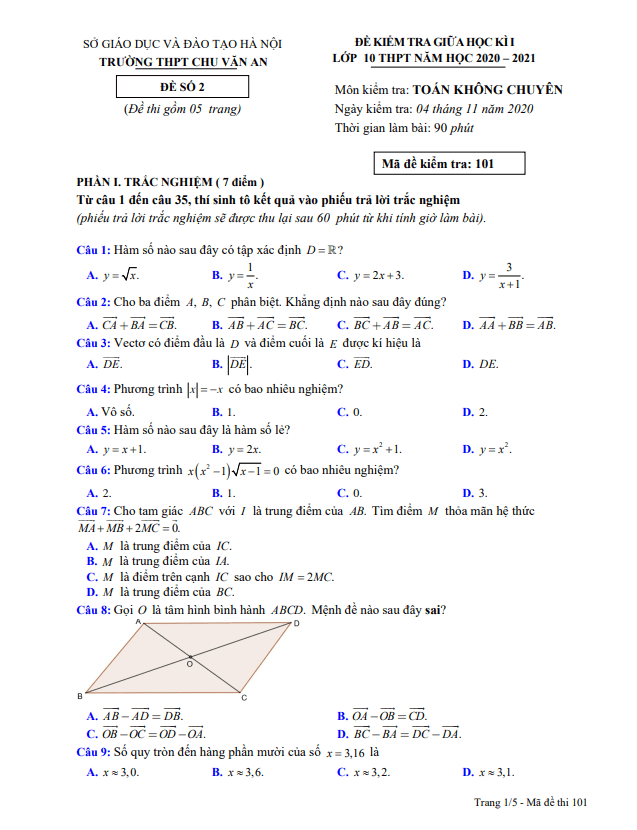 Đề Thi Giữa HK1 Toán 10 Đề thi giữa học kì 1 Toán 10 năm 2020 – 2021 trường THPT Chu Văn An – Hà Nội 17/11/2020