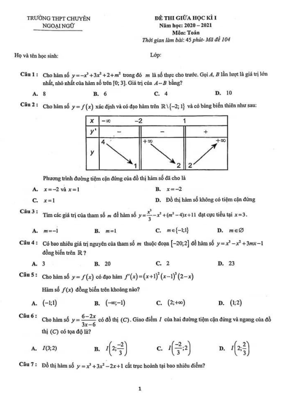 Đề Thi Giữa HK1 Toán 12 Đề thi giữa học kì 1 Toán 12 năm 2020 – 2021 trường chuyên Ngoại Ngữ – Hà Nội 15/11/2020