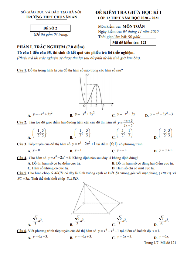 Đề Thi Giữa HK1 Toán 12 Đề thi giữa học kì 1 Toán 12 năm 2020 – 2021 trường THPT Chu Văn An – Hà Nội 17/11/2020