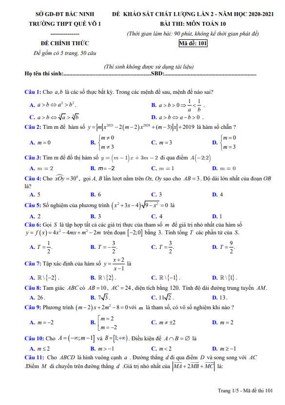Khảo Sát Chất Lượng Toán 10 Đề khảo sát chất lượng lần 2 Toán 10 năm 2020 – 2021 trường Quế Võ 1 – Bắc Ninh 11/01/2021