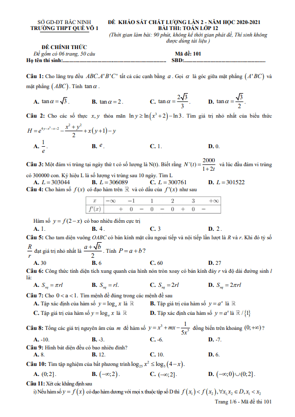 Đề Thi Thử THPT Môn Toán Đề khảo sát chất lượng lần 2 Toán 12 năm 2020 – 2021 trường Quế Võ 1 – Bắc Ninh 11/01/2021