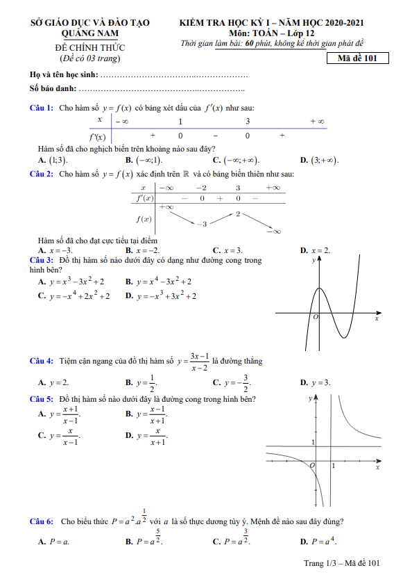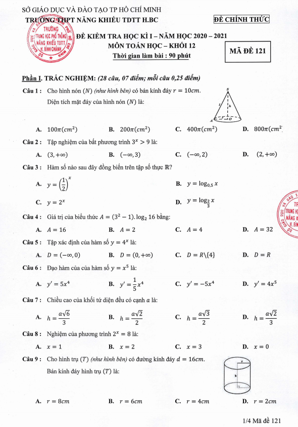 Đề Thi HK1 Toán 12 Đề thi kì 1 Toán 12 năm 2020 – 2021 trường THPT Năng khiếu TDTT Bình Chánh – TP HCM 07/01/2021