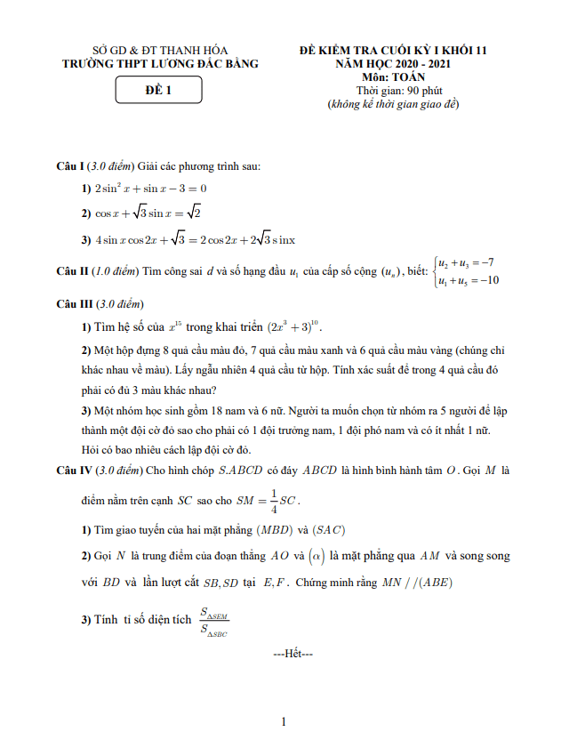 Đề Thi HK1 Toán 11 Đề thi cuối kỳ 1 Toán 11 năm 2020 – 2021 trường Lương Đắc Bằng – Thanh Hóa 08/01/2021