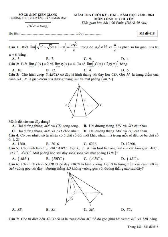 Đề Thi HK1 Toán 11 Đề thi HK1 Toán 11 chuyên năm 2020 – 2021 trường chuyên Huỳnh Mẫn Đạt – Kiên Giang 08/01/2021