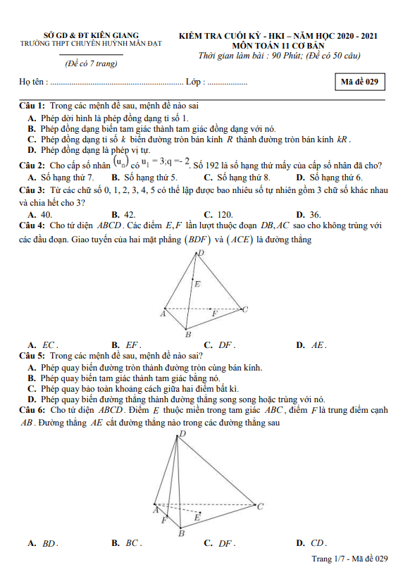 Đề Thi HK1 Toán 11 Đề thi HK1 Toán 11 cơ bản năm 2020 – 2021 trường chuyên Huỳnh Mẫn Đạt – Kiên Giang 07/01/2021