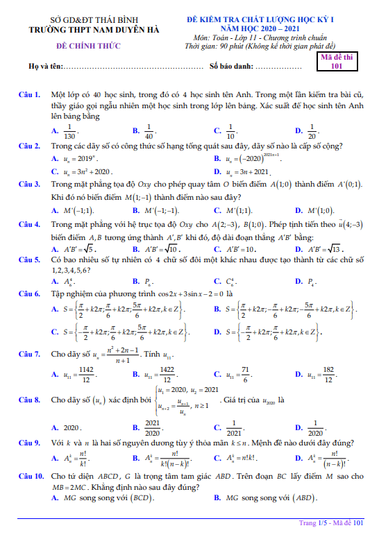 Đề Thi HK1 Toán 11 Đề thi HK1 Toán 11 năm 2020 – 2021 trường THPT Nam Duyên Hà – Thái Bình 08/01/2021