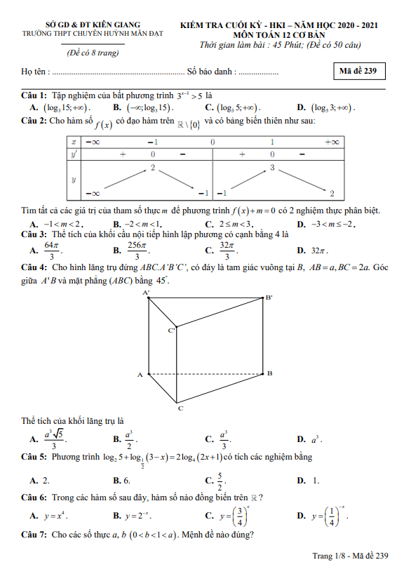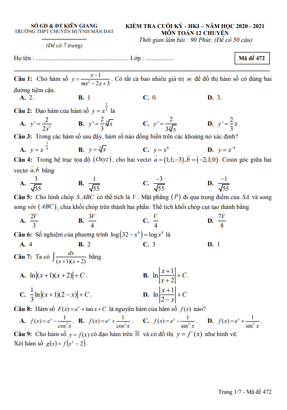 Đề Thi HK1 Toán 12 Đề thi HK1 Toán 12 cơ bản năm 2020 – 2021 trường chuyên Huỳnh Mẫn Đạt – Kiên Giang 07/01/2021