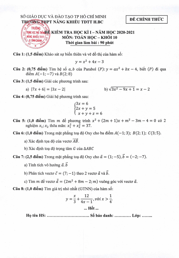 Đề Thi HK1 Toán 10 Đề thi kì 1 Toán 10 năm 2020 – 2021 trường THPT Năng khiếu TDTT Bình Chánh – TP HCM 07/01/2021