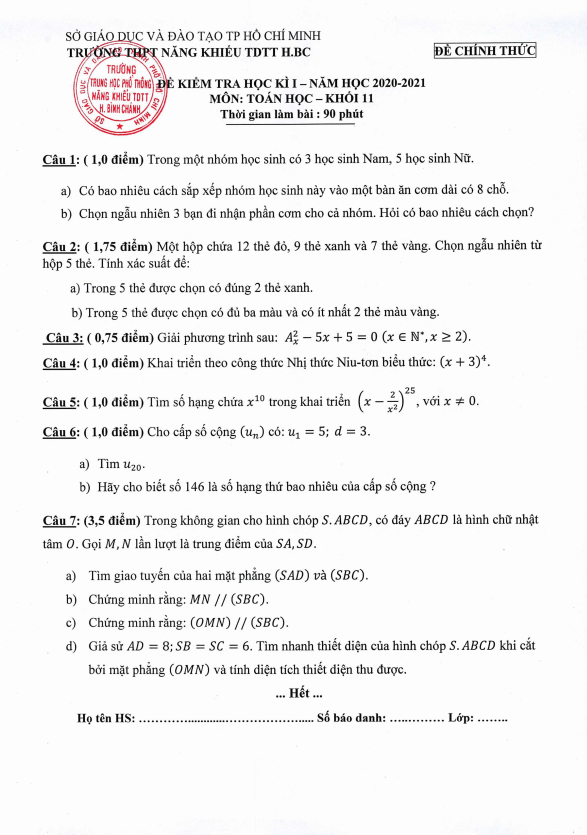Đề Thi HK1 Toán 11 Đề thi kì 1 Toán 11 năm 2020 – 2021 trường THPT Năng khiếu TDTT Bình Chánh – TP HCM 07/01/2021
