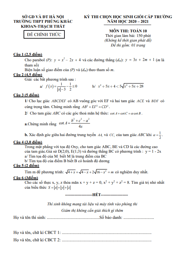 Đề Thi HSG Toán 10 Đề học sinh giỏi Toán 10 năm 2020 – 2021 trường Phùng Khắc Khoan – Hà Nội 15/03/2021