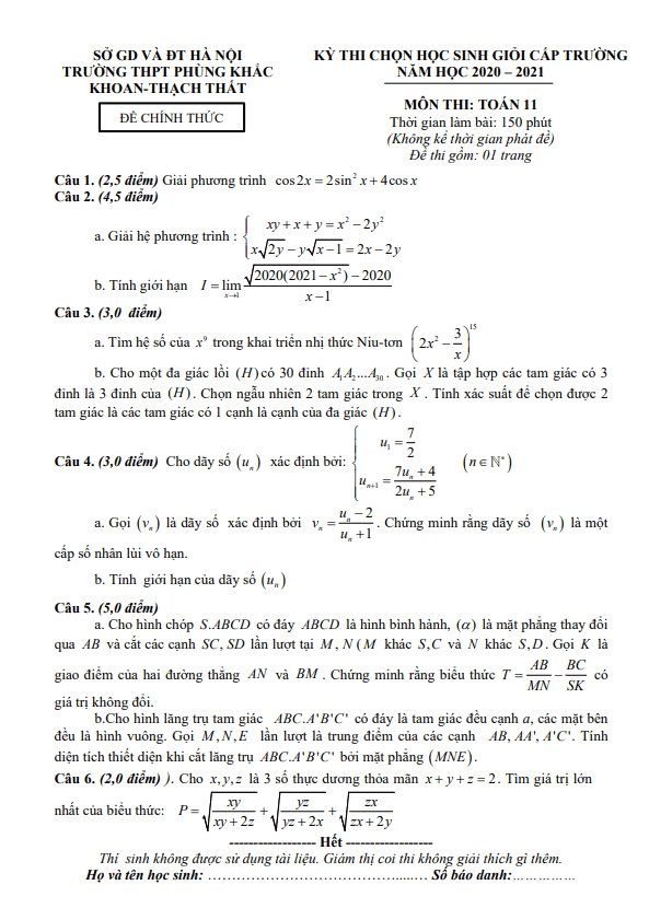 Đề Thi HSG Toán 11 Đề học sinh giỏi Toán 11 năm 2020 – 2021 trường Phùng Khắc Khoan – Hà Nội 15/03/2021