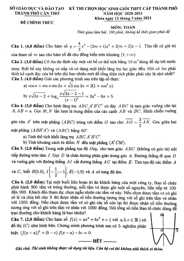 Đề Thi HSG Toán 12 Đề học sinh giỏi Toán THPT cấp thành phố năm 2020 – 2021 sở GD&ĐT Cần Thơ 17/03/2021
