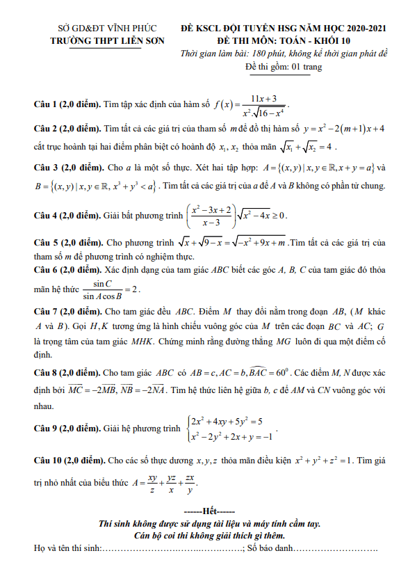 Đề Thi HSG Toán 10 Đề KSCL đội tuyển HSG Toán 10 năm 2020 – 2021 trường Liễn Sơn – Vĩnh Phúc 15/03/2021