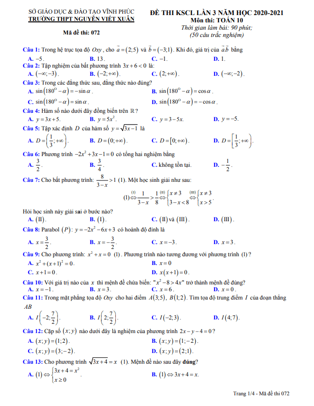 Khảo Sát Chất Lượng Toán 10 Đề KSCL lần 3 Toán 10 năm 2020 – 2021 trường THPT Nguyễn Viết Xuân – Vĩnh Phúc 14/03/2021