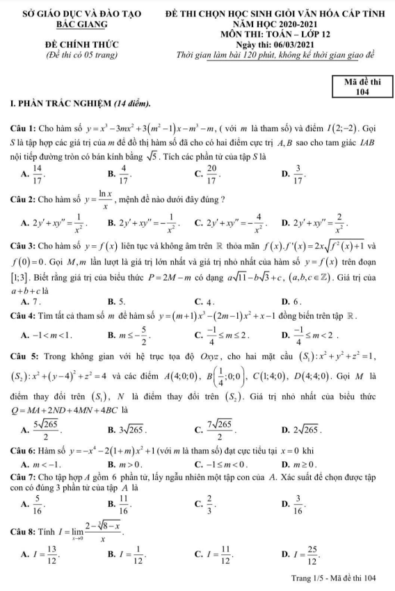 Đề Thi HSG Toán 12 Đề thi học sinh giỏi cấp tỉnh Toán 12 năm 2020 – 2021 sở GD&ĐT Bắc Giang 17/03/2021