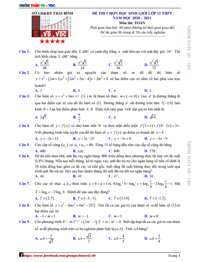 Đề Thi HSG Toán 12 Đề thi học sinh giỏi Toán 12 cấp tỉnh năm 2020 – 2021 sở GD&ĐT Thái Bình 13/03/2021