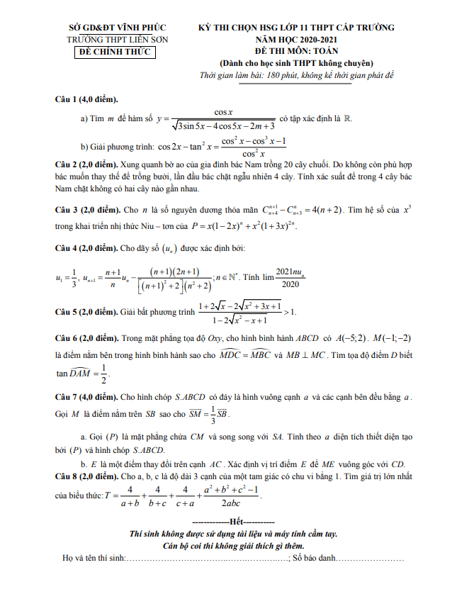 Đề Thi HSG Toán 11 Đề thi HSG Toán 11 cấp trường năm 2020 – 2021 trường Liễn Sơn – Vĩnh Phúc 15/03/2021