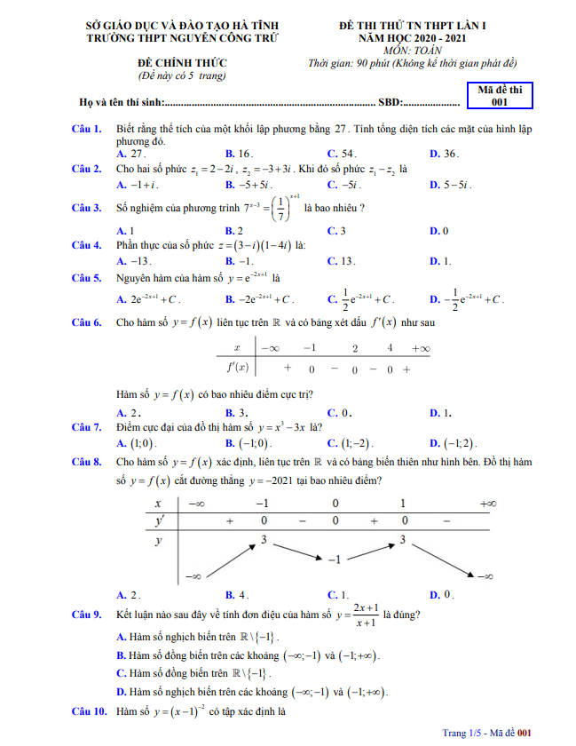 Đề Thi Thử THPT Môn Toán Đề thi thử Toán TN THPT 2021 lần 1 trường Nguyễn Công Trứ – Hà Tĩnh 14/03/2021