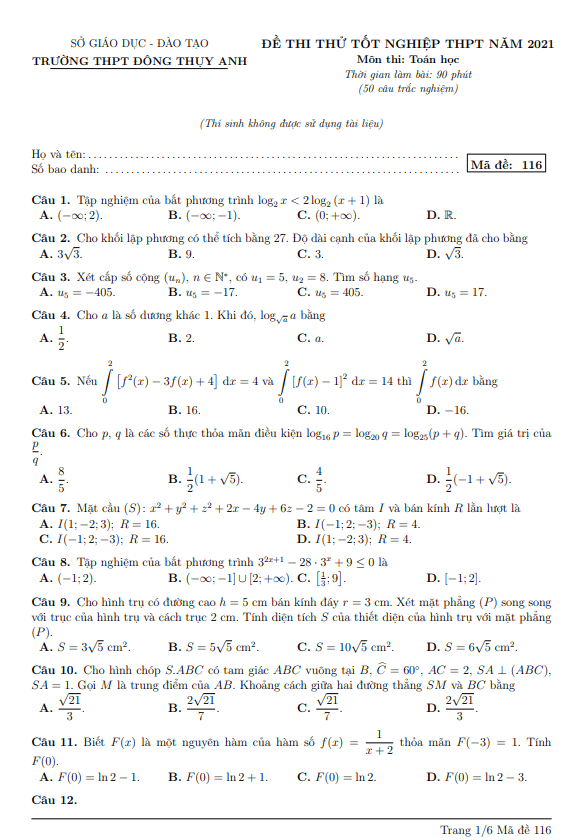 Đề Thi Thử THPT Môn Toán Đề thi thử Toán TN THPT năm 2021 trường Đông Thụy Anh – Thái Bình 15/03/2021