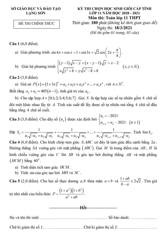 Đề Thi HSG Toán 11 Đề thi học sinh giỏi cấp tỉnh Toán 11 năm 2020 – 2021 sở GD&ĐT Lạng Sơn 16/03/2021