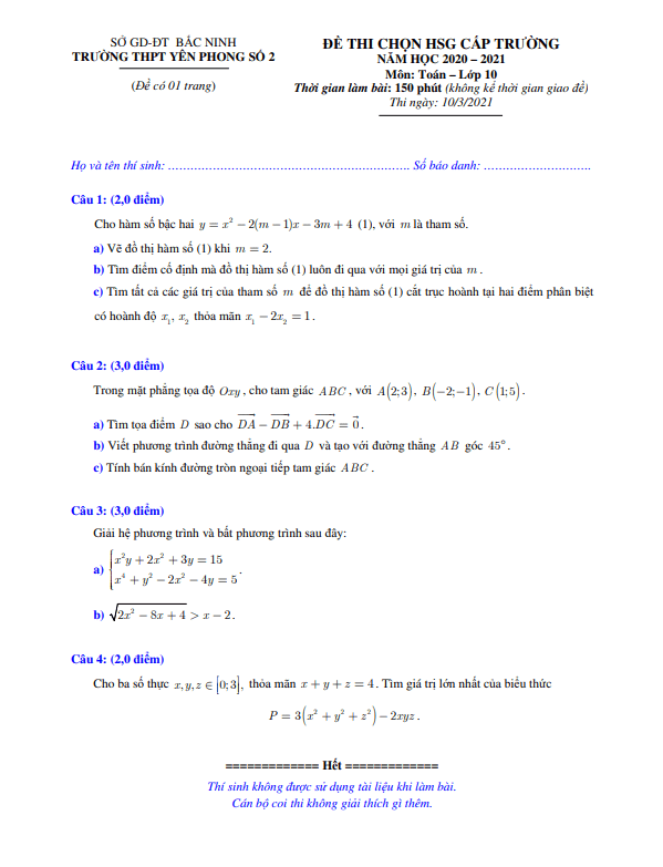Đề Thi HSG Toán 10 Đề HSG cấp trường Toán 10 năm 2020 – 2021 trường Yên Phong 2 – Bắc Ninh 12/03/2021