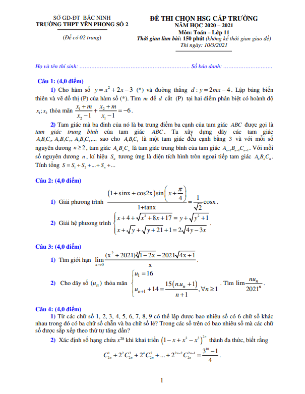 Đề Thi HSG Toán 11 Đề HSG cấp trường Toán 11 năm 2020 – 2021 trường Yên Phong 2 – Bắc Ninh 12/03/2021