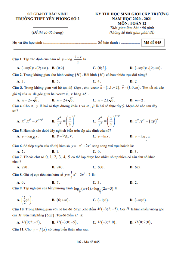 Đề Thi HSG Toán 12 Đề HSG cấp trường Toán 12 năm 2020 – 2021 trường Yên Phong 2 – Bắc Ninh 13/03/2021