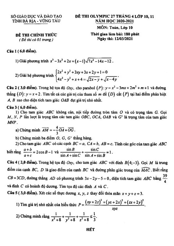 Đề Thi HSG Toán 10 Đề Olympic 27 tháng 4 Toán 10 năm 2020 – 2021 sở GD&ĐT Bà Rịa – Vũng Tàu 12/03/2021