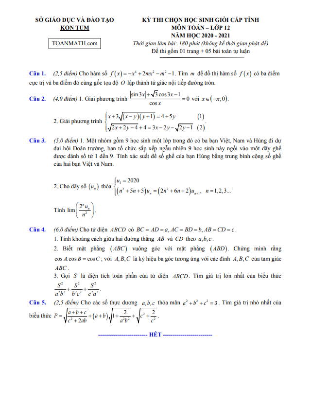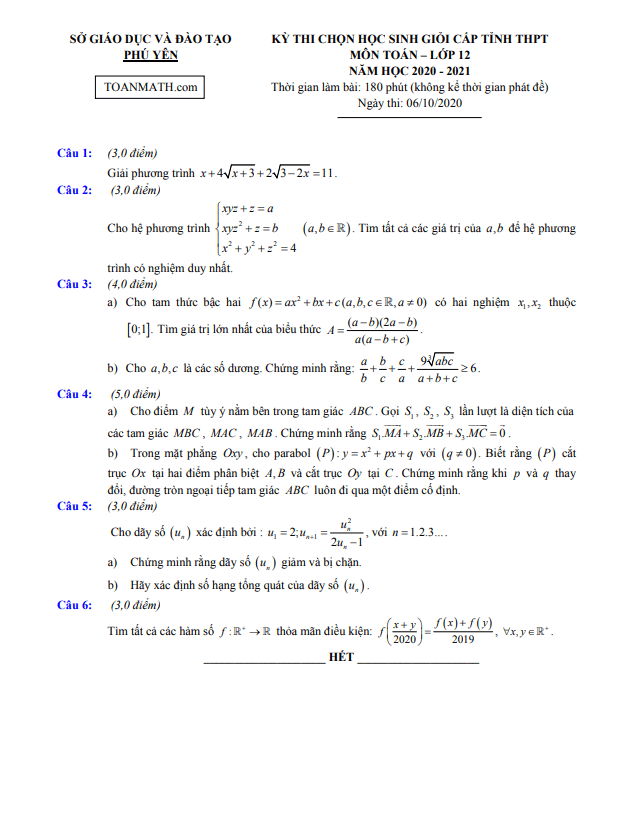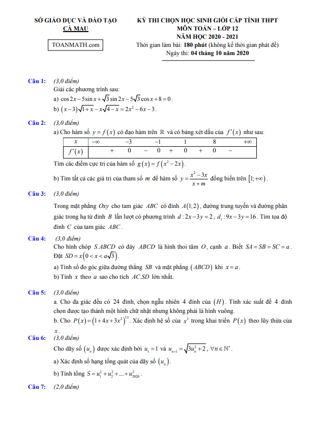 Đề Thi HSG Toán 12 Đề thi học sinh giỏi Toán 12 cấp tỉnh năm 2020 – 2021 sở GD&ĐT Bình Thuận 13/03/2021