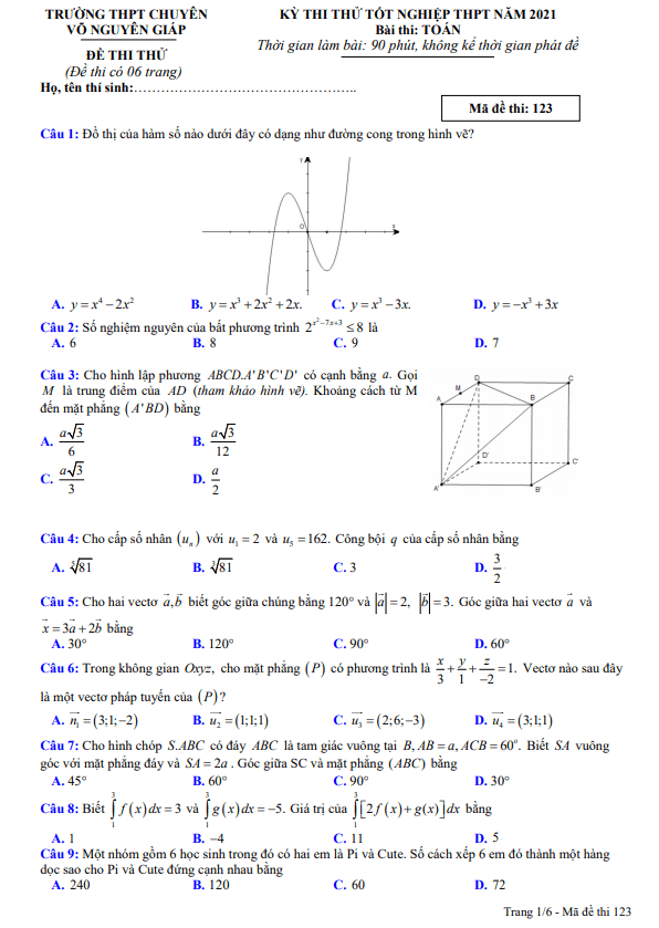 Đề Thi Thử THPT Môn Toán Đề thi thử Toán TN THPT 2021 trường chuyên Võ Nguyên Giáp – Quảng Bình 13/03/2021